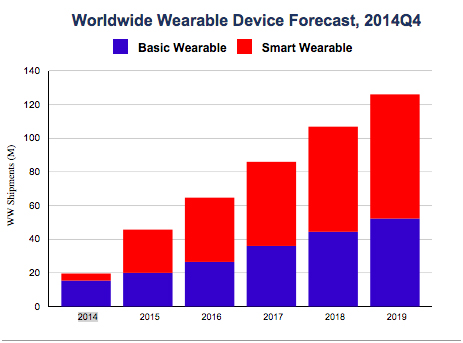 據(jù)國外媒體報道,根據(jù)研究機構IDC的預測,全球可穿戴設備2015年的出貨量將達到4570萬,而2019年的出貨量將達到1.261億,這意味著大約45%的年增長率。