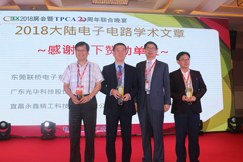 白天的展覽結(jié)束后, CTEX2018展會(huì)暨TPCA 20周年聯(lián)合晚宴正式拉開帷幕。TPCA理事長(zhǎng)吳永輝先生首先致辭,并為光華科技等贊助商感謝致贈(zèng)。