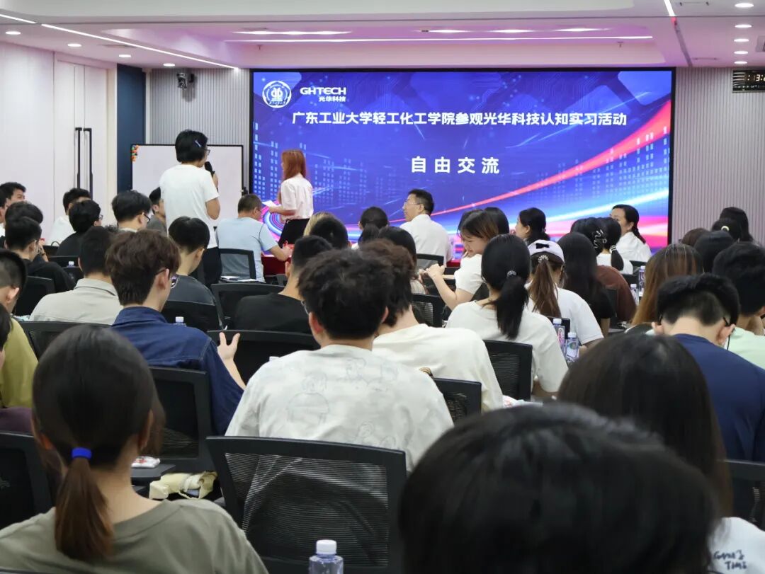 活動當天,廣東工業(yè)大學輕化學院的鐘遠紅副院長、陳繼忠教授等老師帶領(lǐng)150多名23級輕化學院應(yīng)用化學的同學們來到了GHTECH光華科技進行參觀學習。光華科技技術(shù)中心主任劉彬云、人力資源部總經(jīng)理曾萍、技術(shù)中心科技發(fā)展部總監(jiān)賴少媚等代表進行了熱情接待。